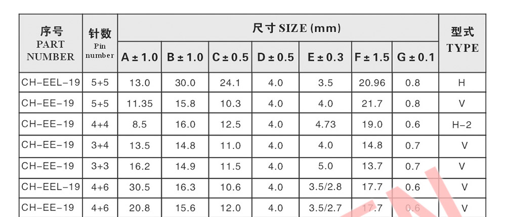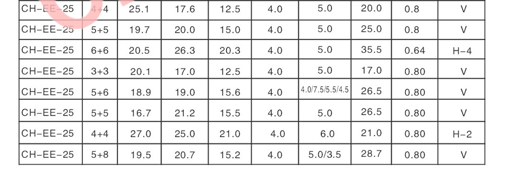 EE5/0.6W, EE8.3/2W, EE10/5W, EE12.8/7W, EE13/8-16W, EE16/10-15W, EE19/14-24W, EE22/20W, EE25/33-60W, EE28/60W, EE30/90W, EE32/95W, EE33/120W, EE34/100W, EE35/90-125W, EE40/175W,EE42/265-350W, EE55/660-800W, EE65/900-1250W, EE70/1500W