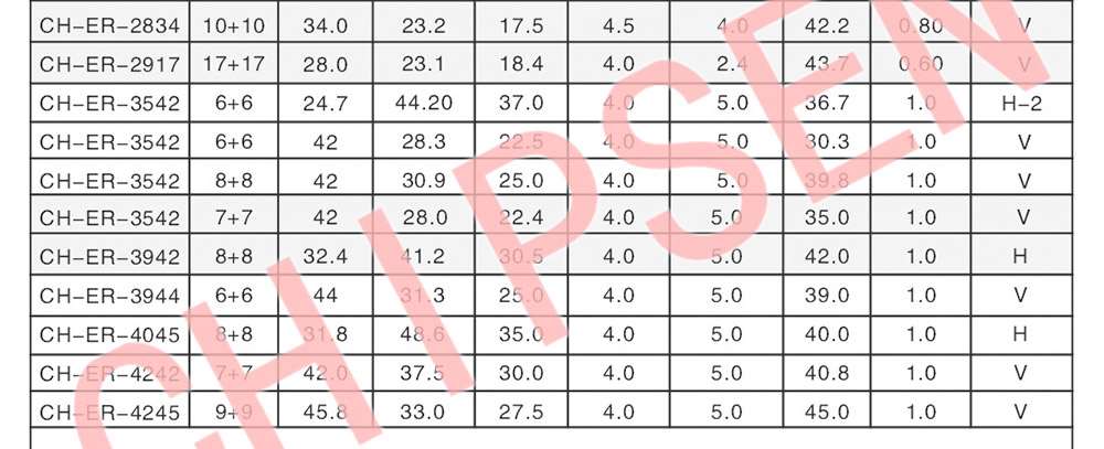 ER9.5/2W, ER11.5/3.5W, ER14.5/5-6W, ER17.5/16W, ER20/17W, ER24.9/58W, ER25/25-35W, ER28/85-100W, ER29/100W, ER30/80-100W, ER33/150W, ER35/120-160W, ER39/180-190W, ER40/230-240W, ER42/280-350W, ER49/390-450W, ER70/770W, ER90/2000W, ER120/2300W